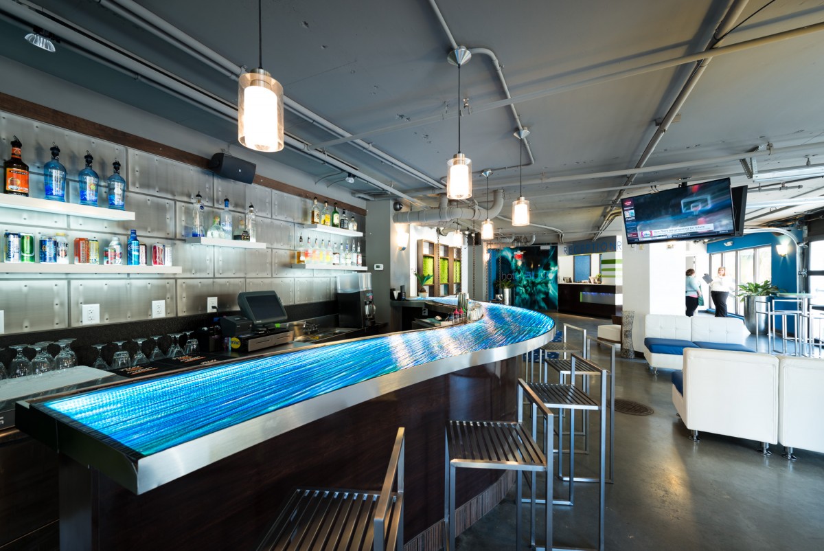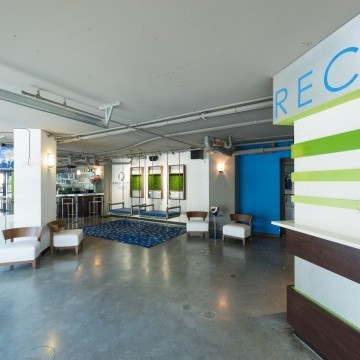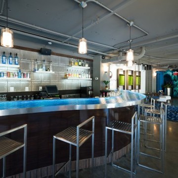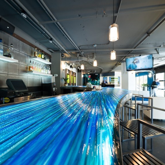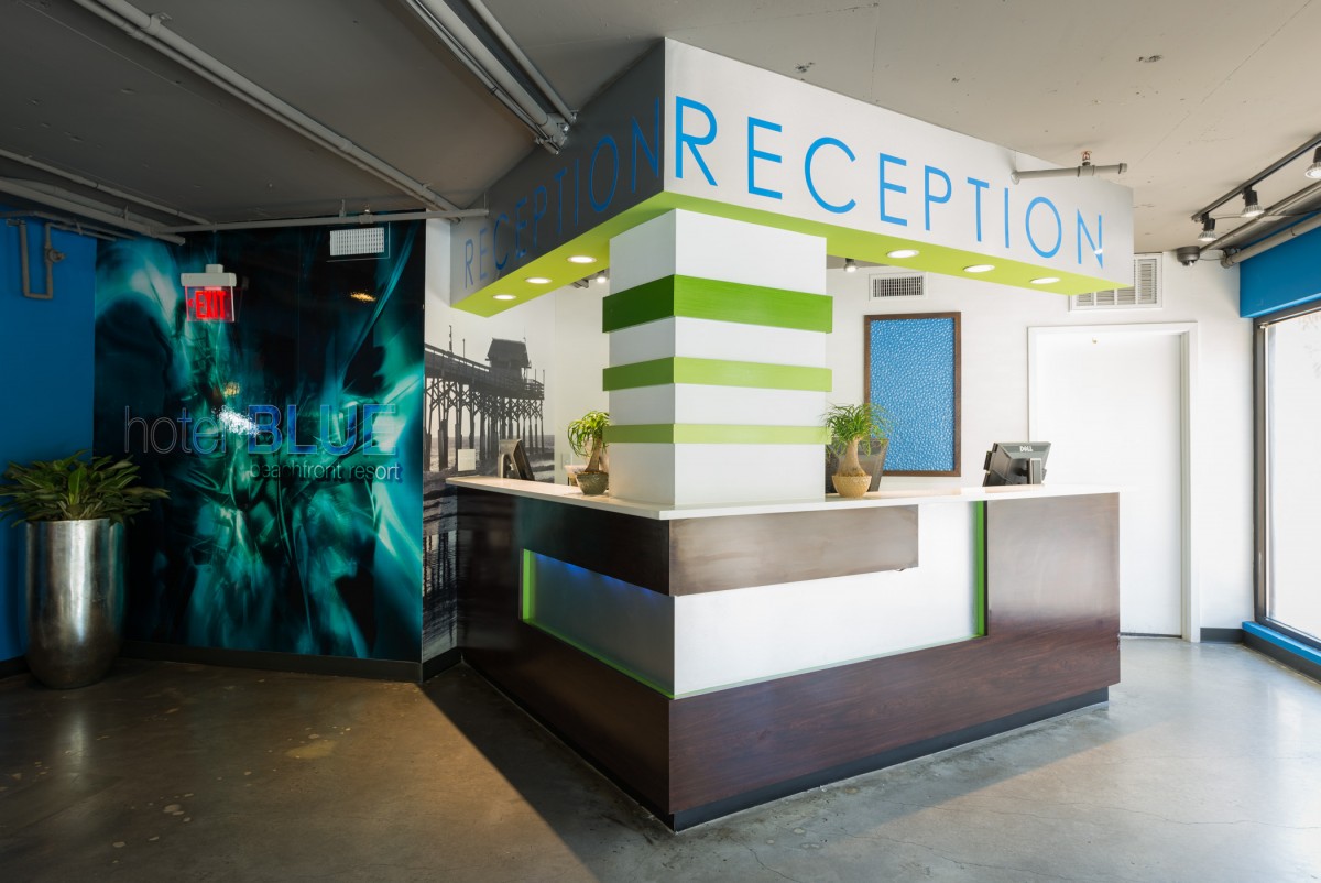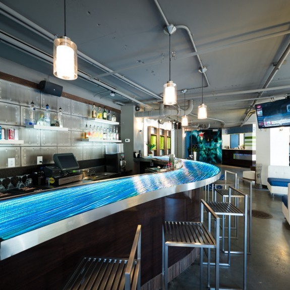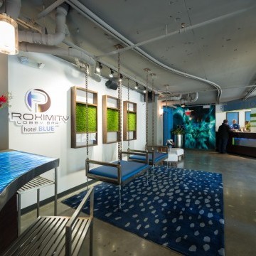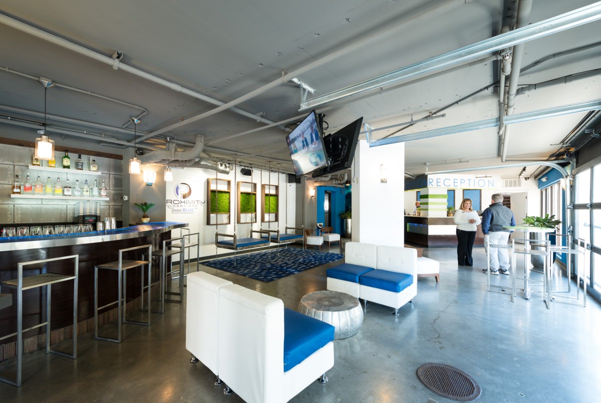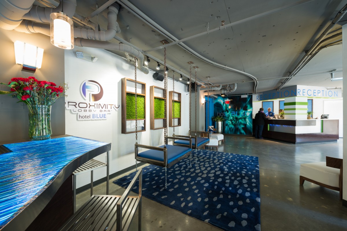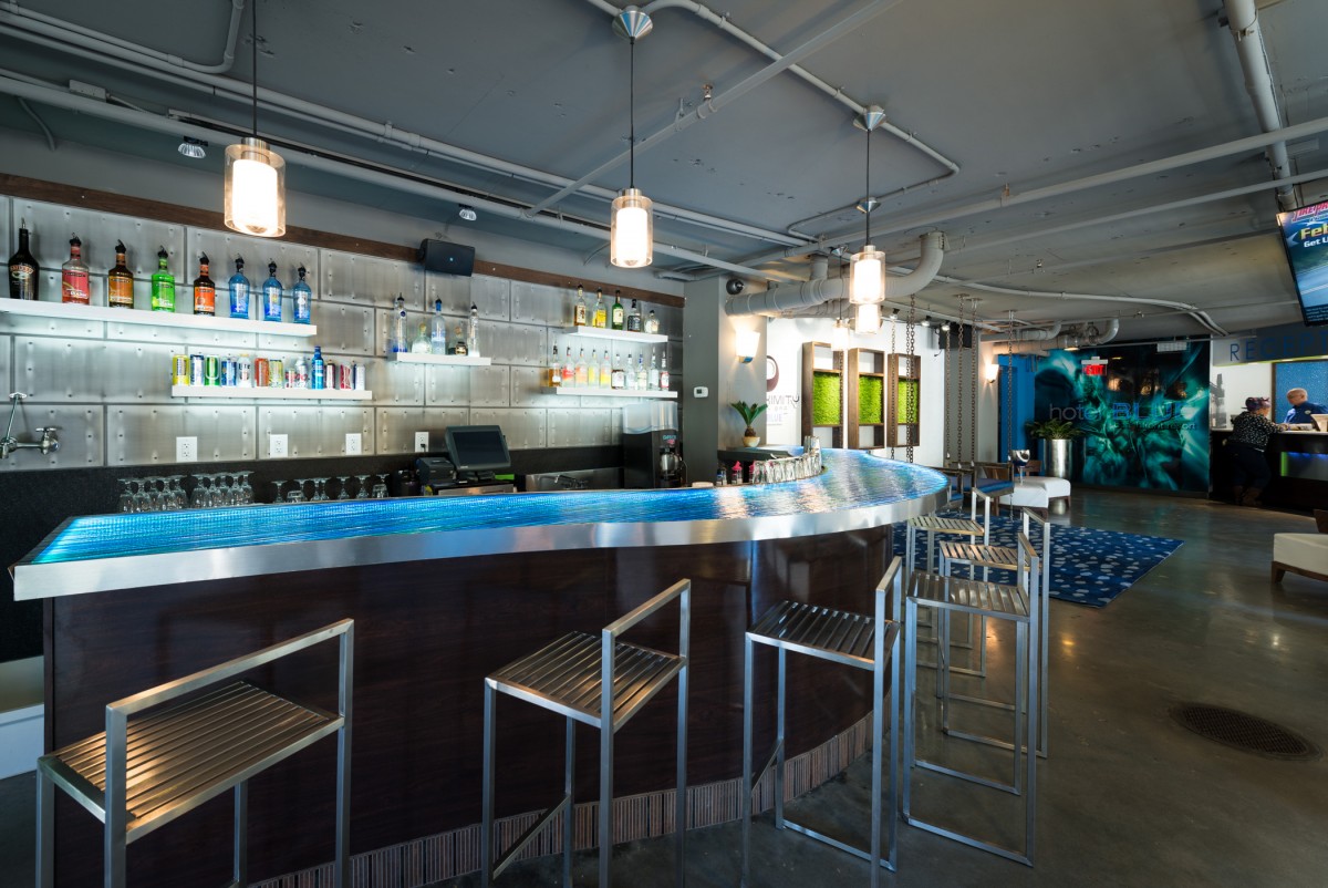 Hotel Blue was completed in collaboration with WHCI as a design build project. The existing space consisted of a traditional lobby check in desk with support spaces behind. The existing ceilings and walls were all eliminated to create an open, contemporary check in area that also functions as a lounge space. The dual function space allows guests to have a pleasant experience when checking in. Moreover, the existing storefront was replaced by overhead glass doors allowing the space to be opened up to the outside connecting it to the new outdoor lounge space. The interior design incorporates bold accent colors, a unique swing lounge bench, and a beautiful glass bar top that emulates water.