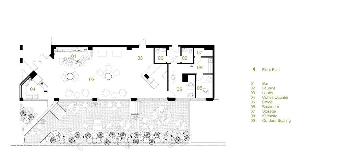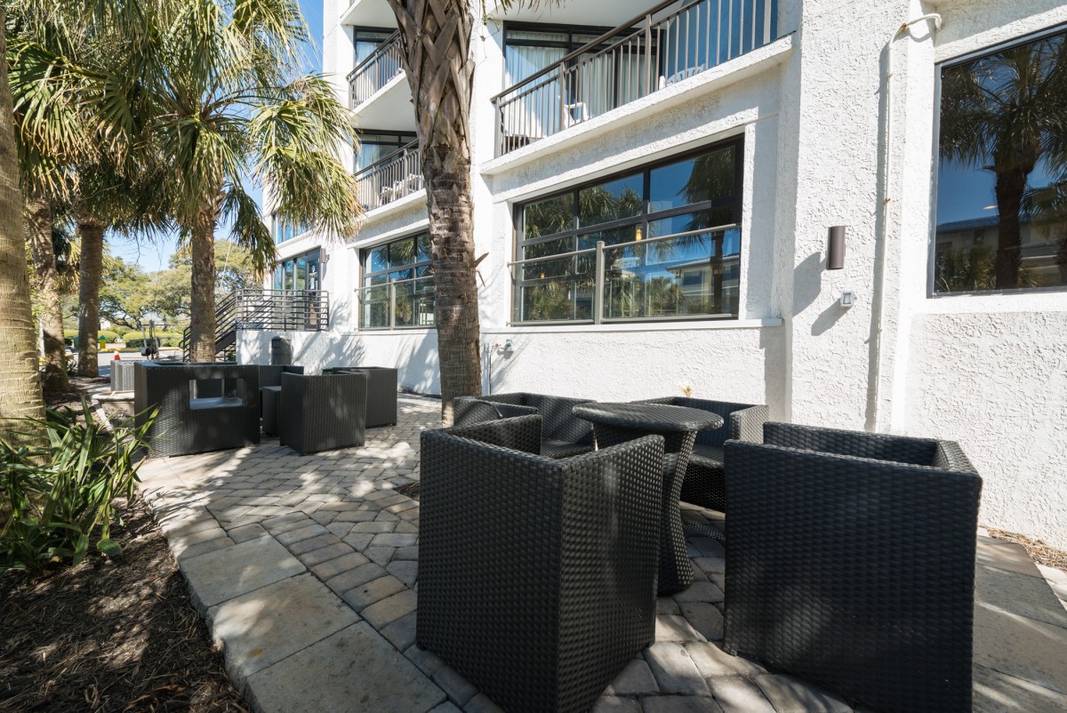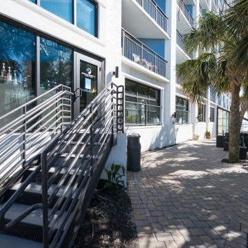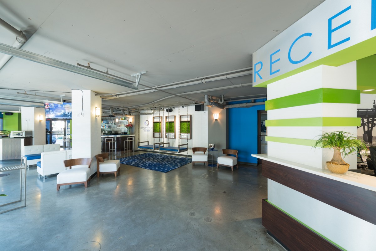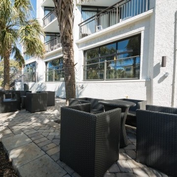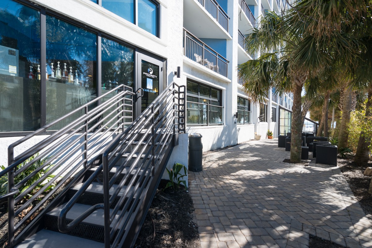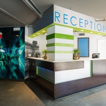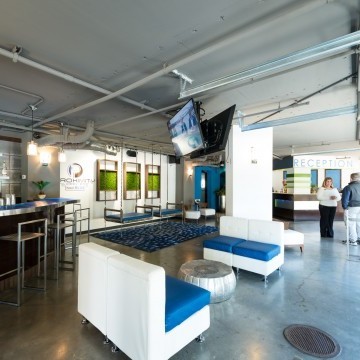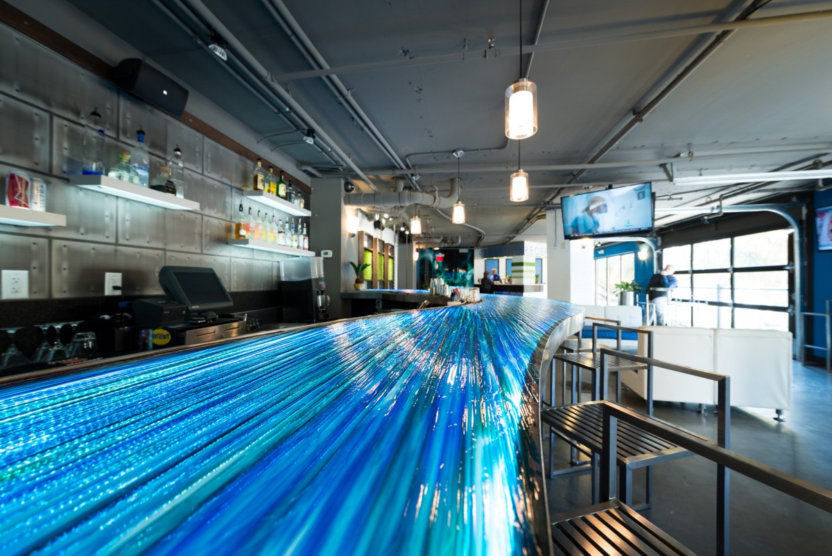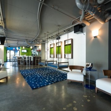 Hotel Blue was completed in collaboration with WHCI as a design build project. The existing space consisted of a traditional lobby check in desk with support spaces behind. The existing ceilings and walls were all eliminated to create an open, contemporary check in area that also functions as a lounge space. The dual function space allows guests to have a pleasant experience when checking in. Moreover, the existing storefront was replaced by overhead glass doors allowing the space to be opened up to the outside connecting it to the new outdoor lounge space. The interior design incorporates bold accent colors, a unique swing lounge bench, and a beautiful glass bar top that emulates water.