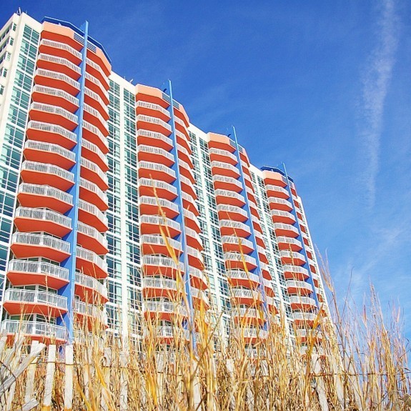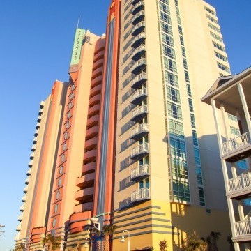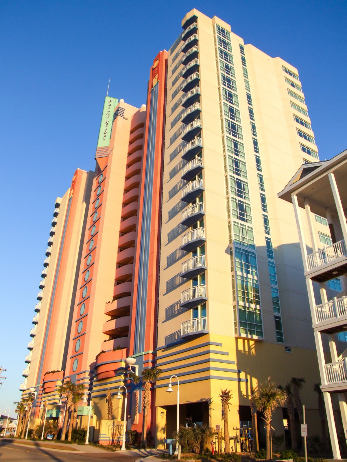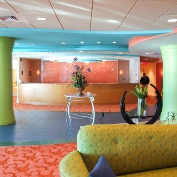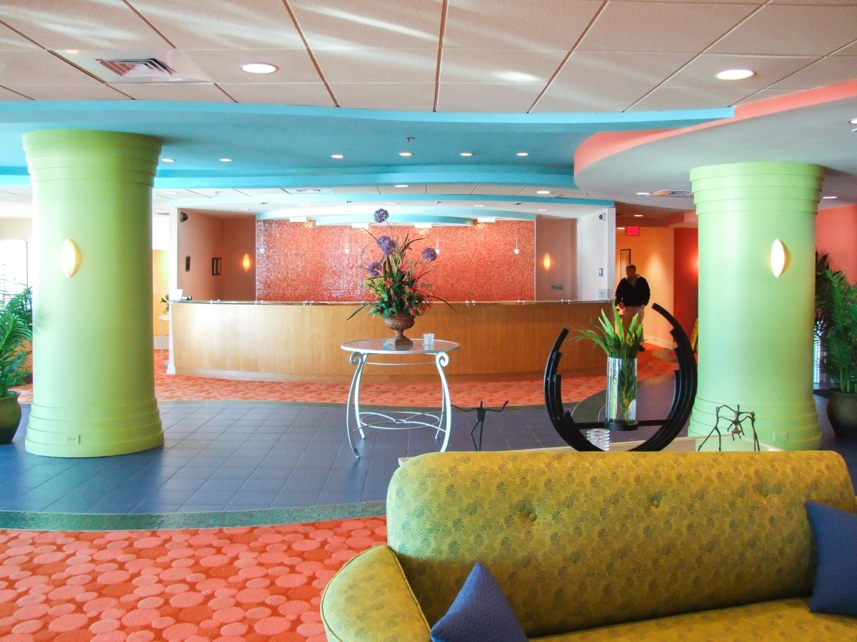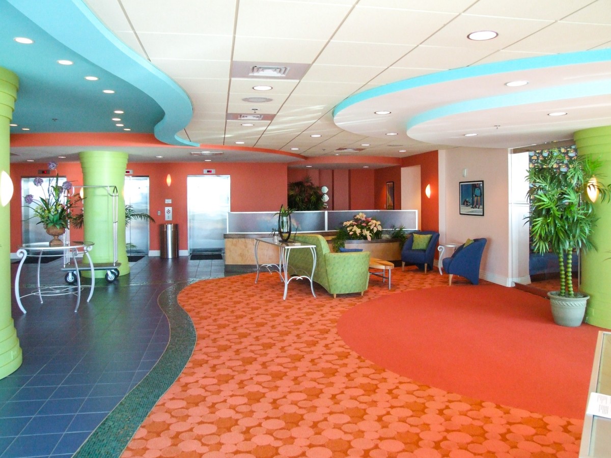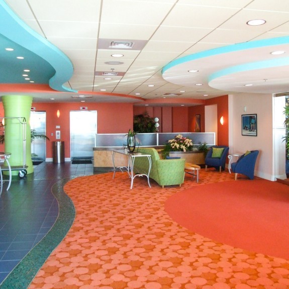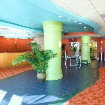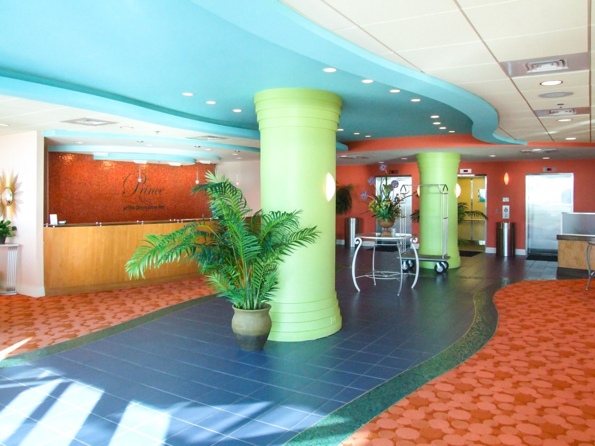 The Prince Resort architectural design references Art Deco. Keeping consistent with this, the interior design also takes from Art Deco placing strong emphasis on repetitive geometric form. The design also takes into consideration the ocean view from the lobby. The fluid form of the ceiling and floor pattern on axis with the elevator lobby draws the visitors' focus to the ocean view upon entering the lobby space. The spatial layout allows guests to take advantage of the ocean vista by purposely keeping the separation between the lobby and the restaurant transparent. Design features of the space include strong circular forms in the floor pattern and ceiling in a stepping fashion. The color palette is complementary to the exterior of the towers. The use of glass mosaics on the floor and registration backdrop add a level of sophistication to the space.