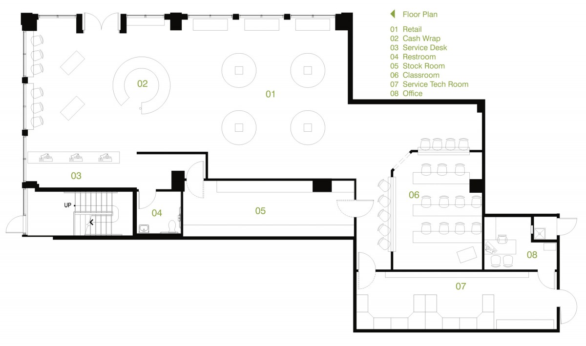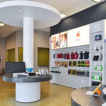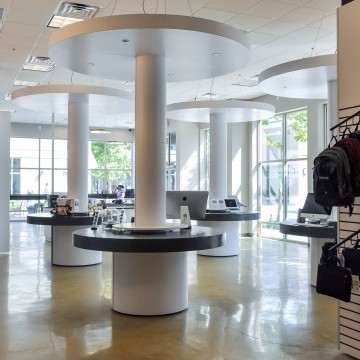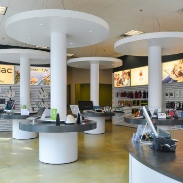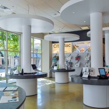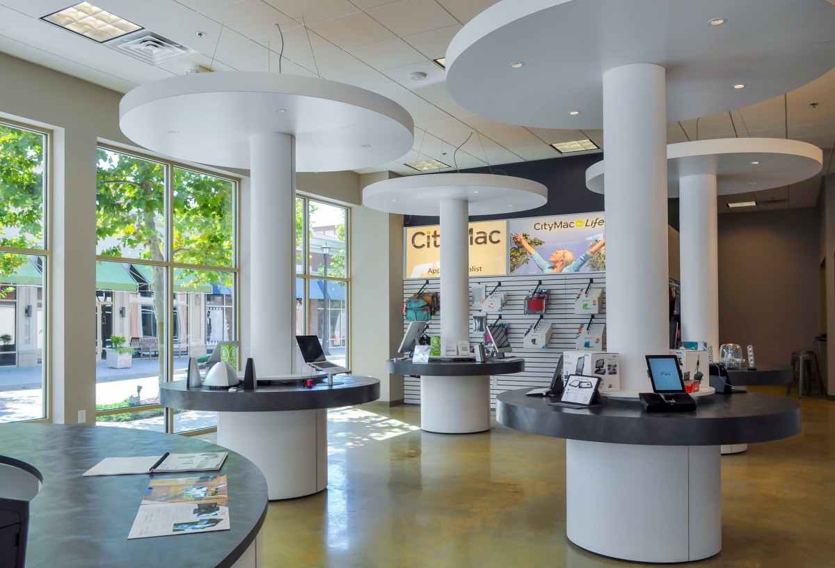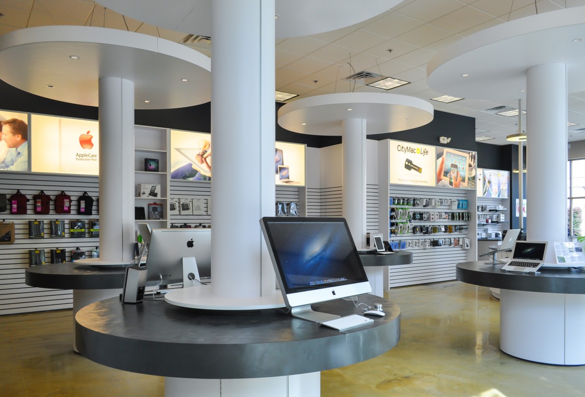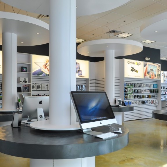 In many retail projects, the Architect is a key team member to execute the lease for a particular space. This is an example of such project. CityMac was contemplating two separate spaces. e3 studio led a design charette with the Landlord and Tenant over two days to determine which space would be most efficient for the store. Working around the conference table at the Market Common office, we corroboratively planned the store for each space. The exercise revealed which space would be most profitable and the lease was signed. e3 studio worked diligently to deliver construction documents within two weeks. The exterior facade of the building was designed to reflect the CityMac brand and the Interior Design reflects the tech company’s image.